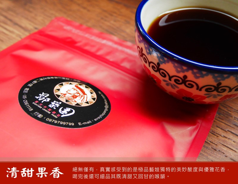 得獎無數的阿里山鄒築園咖啡王子,彷彿施魔法般的將風味獨具的外來王子『巴拿馬藝妓豆』,在台灣阿里山上落地生根再稱王!濃入口時甜滋滋的蜜蔗香、柑橘果香氣在舌尖上跳躍著,讓人無限驚豔!
