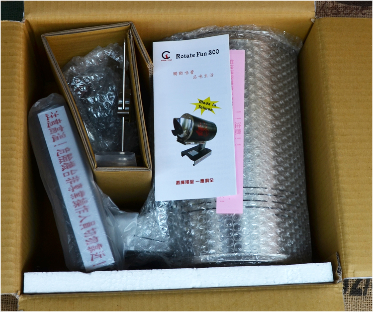 裝箱內容,RotateFun300烘豆機*1 、毛刷*1、溫度計*1。高速快速散散熱盤另外裝箱。