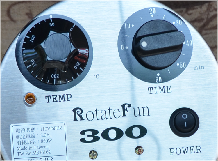 RotateFun300烘豆機背面附有時間與溫度旋鈕,操作者可依自己經驗做調整,烘出最理想的咖啡豆。