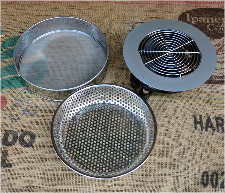 快速散熱盤裝箱內容,主要有三部件,下豆盤 、濾網 、底座( 風扇),電源線上有風扇開關,下豆後開啟風扇開關可使豆子迅速降溫冷卻。